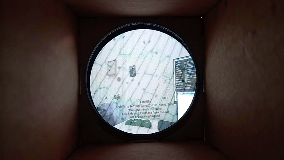 The audience peeks into the small room of a person through a microscope that has two controllers. Using the knob on the right side, a stage controller, the audience can look around the room as it rotates the camera situated at the center of the microhabitat. Using the knob on the left side, coarse adjustment, the user can look into the details on specific objects located in the room. Each object contains a personal story of the person living there as if you see the product details of objects that YouTube has in one’s open-door video.