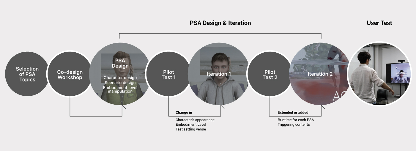 It is created referring to the following research – 1) the guideline addressed in PSA theory 2) analyzed result of the co-design workshop, (3) flow patterns, appearing elements, and stimulus of the previous PSA films. The initial PSAs design was iterated based on findings from the pilot test 1 and 2.
